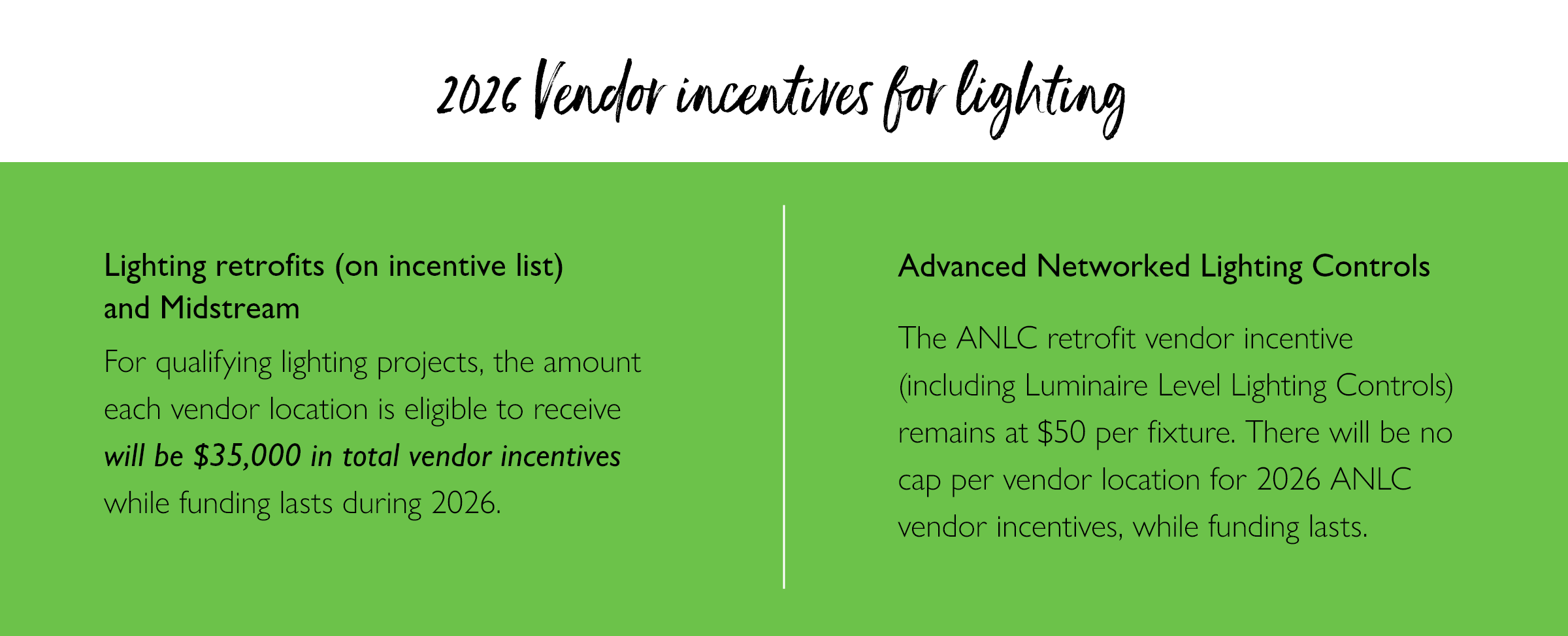 For qualifying lighting projects, vendors receive the vendor incentive of $0.05 per kWh annual energy savings with a maximum vendor incentive of $5,000 per customer location in 2026. Each vendor location is eligible to receive $20,000 in total incentives in 2026.